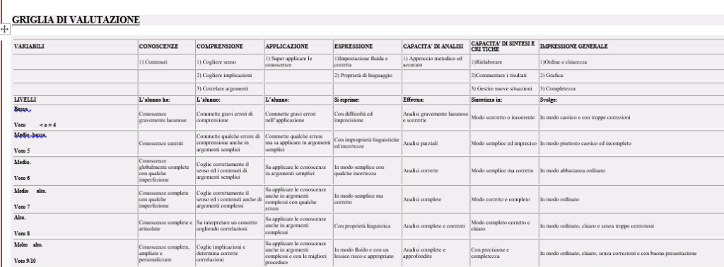 | Medio basso Voto 5 | Conoscenze carenti | Commette qualche errore di comprensione anche in argomenti semplici | Commette qualche errore ma sa applicare in argomenti semplici | Con improprietà linguistiche ed incertezze | Analisi parziali | Modo semplice ed impreciso | In modo piuttosto caotico ed incompleto |