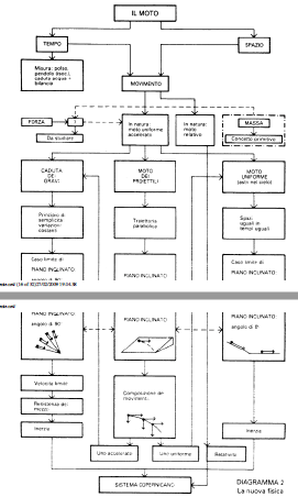 La sorveglianza fuori della casa di Galileo ad Arcetri era strettissima ma con la complicità di qualche amico e di sua figlia Livia (Suor Arcangela) riuscì a fare uscire a poco a poco dei manoscritti per la successiva pubblicazione. Questi manoscritti erano stati raccolti in anni precedenti, si tratta dei suoi studi precedenti aggiornati e sistemati. Galileo li fa uscire perché vadano presso gli Elzeviri di Leiden (Olanda) al fine di essere pubblicati. Ne verrà fuori la più grande opera di Galileo, quella della maturità. Si tratta dei Discorsi e dimostrazioni matematiche intorno a due nuove scienze che vedrà la luce nel 1638. Ora non vi sono più conversazioni accattivanti, ora si tratta di un vero e proprio testo di fisica in cui vengono studiati tutti i vari campi della conoscenza dell’epoca. È la più copernicana tra le sue opere ma, proprio perché non capita dalle autorità, fu fatta passare senza eccessive reprimende (Galileo si difese sostenendo che l’opera era stata pubblicata a sua insaputa). In tale opera gli argomenti trattati(54 bis) sono: – l’indicazione di un modo di misurare la velocità della luce (fuori dalla portata dell’epoca ma con la fondamentale intuizione di luce con velocità finita e misurabile); – questioni di acustica; – moto del pendolo; – moto dei proiettili; – moto dei gravi; – resistenza dei materiali; – fondamenti e sviluppi della dinamica sulla Terra; – gravi su piani inclinati; – questioni matematiche; – meccanismo per il funzionamento di orologi; – paradossi dell’infinito (una parte è uguale al tutto); – questioni di ottica; – questioni di idrostatica; – questioni di termologia. Come si vede i problemi presenti a Galileo abbarcavano problematiche di ogni tipo e questo libro è il fondamento imprescindibile per la nuova fisica che piano piano si affermerà sulle ceneri della scolastica. Scendiamo in un qualche dettaglio, tralasciando questioni particolari che non mi pare ora il caso di affrontare (ma tutte comunque finalizzate alla demolizione sistematica della fisica di Aristotele). Il problema principale da cui Galileo parte è il moto. Per studiarlo occorre studiare il tempo e lo spazio. E lo studio deve essere quantitativo, non più eminentemente descrittivo. Occorre inventarsi degli strumenti di misura. Le lunghezze non presentano alcun problema: dei buoni regoli possono risolvere ogni questione. Il tempo presenta invece notevoli difficoltà (in assenza di orologi di qualunque tipo, se si escludono le non affidabili clessidre): Galileo le risolve utilizzando un fenomeno che egli stesso aveva scoperto in gioventù, l’isocronismo del pendolo. E non solo. Altri strumenti di misura del tempo, che egli utilizza per controllare la correttezza delle prime misure, sono i battiti del polso e una sorta di orologio ad acqua (da un serbatoio l’acqua cade, goccia a goccia, in un recipiente sottostante disposto sul piatto di una bilancia; l’ago della bilancia è l’indice del trascorrere del tempo). Un grande problema è costituito dalla misura di piccoli intervalli di tempo, fatto che si presenta, ad esempio, nello studio degli oggetti in caduta. A questa difficoltà Galileo sopperisce “rallentando” la caduta mediante un piano inclinato: anziché far cadere un oggetto verticalmente egli usa delle sfere che “cadono” lungo un piano inclinato (non è banale ricordare che ciò presuppone la conservatività del campo gravitazionale). In queste modo, il medesimo fenomeno di caduta avviene in un tempo maggiore, tale da poter essere registrato dagli strumenti di misura di Galileo. Ma il piano inclinato, come si può vedere dal Diagramma che propongo, gioca in Galileo un ruolo molto più importante: ogni fenomeno viene ricondotto ad esso e, tramite esso, studiato nei suoi dettagli.