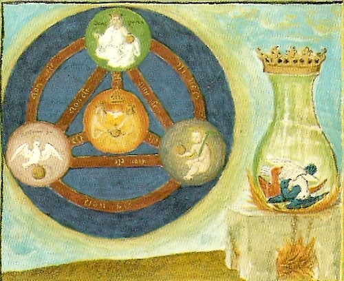 La teoria degli elementi costituenti il mondo è antica come lo stesso pensiero classico greco. La sua sintesi ed ultima elaborazione fu di Aristotele nel V secolo a.C. I quattro elementi (da Empedocle) sono quelli che empiricamente osserviamo intorno a noi: terra, acqua, aria, fuoco. L’ordine non è indifferente perché gli elementi hanno dignità diverse. La terra che sta più in basso (cade al fondo nell’acqua e cade attraverso l’aria) è l’elemento più volgare. L’acqua sta sopra la terra ma cade nell’aria e quindi sta più su della terra. Ancora più su vi è l’aria che sale dall’acqua verso l’alto ed ancora più degno è il fuoco che s’innalza addirittura nell’aria. Il mescolamento in varie proporzioni di questi quattro elementi crea il mondo volgare che si trova sotto la Luna (il cielo della Luna). Si capisce subito come questa base di pensiero sia fondante per una alchimia colta. Ma la teoria dei quattro elementi prevede dell’altro.