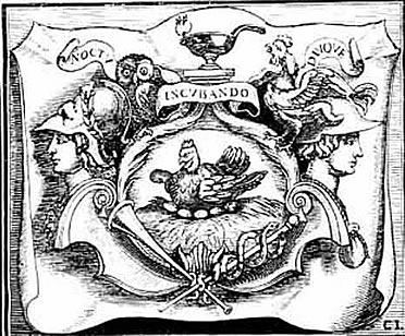 Da Arthur Henkel, Albrecht Schone, Emblemata, ristampa, Stoccarda 1967. Dal frontespizio di un monumentale commentario biblico di un monaco del XVII secolo dove si riportano Glossae medievali di Strabone e di Nicola di Lyra. A partire dal 2° volume, i successivi cinque tomi portano sul frontespizio un’immagine mitologica, con la scritta noctu incubando diuque. Si allude al significato dell’Opus di Dio, consistente nell’operare la trasformazione della vita, la nascita di una creatura nuova, come il pulcino nasce dalla gallina che lo cova. Il “noctu diuque” indica, inoltre, come il processo spirituale non deve avere soluzione di continuità.