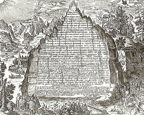 Le tavole smeraldine (la lapide sulla tomba di Hermes Trismegisto) nell’immaginazione dell’alchimista Heinrich Khunrath. Da Amphitheatrum sapientiae aeternae, Hannover 1606.