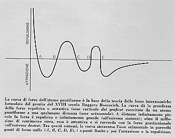 Questa teoria aveva il pregio di conciliare, in qualche modo, il punto di vista della continuità (le forze sono ovunque presenti) con quelle della discontinuità (i punti inestesi). Essa inoltre si prestava molte bene ad una trattazione matematica e permetteva di spiegare tutte le proprietà e qualità della materia partendo dal punto inesteso come costituente comune della materia stessa (in pratica si aveva a che fare con un solo tipo di atomo che combinandosi variamente ed oscillando continuamente intorno alla sua posizione di equilibrio permetteva il formarsi delle varie sostanze con le diverse proprietà chimiche e fisiche). E’ interessante vedere una curva di forza tra due punti atomi di Boscovich perché in essa sono previste forze alternativamente attrattive e repulsive :