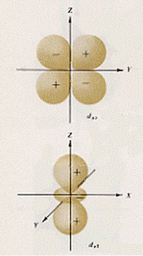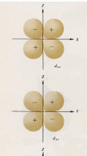 In definitiva: la funzione d’onda ψ è l’orbitale atomico e la densità di probabilità di trovare l’elettrone in questo orbitale ci è data da ψ modulo quadro; ogni elettrone ha associati quattro numeri quantici e, per il principio di Pauli, in un atomo non vi possono essere due elettroni con tutti e quattro i numeri quantici uguali o, che è lo stesso, su di un orbitale vi possono essere due elettroni solo se questi hanno spin opposti; così come i livelli energetici della teoria di Bohr-Sommerfeld, anche gli orbitali hanno energie caratteristiche (in un orbitale se vi sono orbitali diversi con identiche energie, questi orbitali sono chiamati degeneri); tra orbitali diversi possono avvenire transizioni di elettroni (se la transizione avviene da un orbitale ad energia più bassa ad uno ad energia più alta si ha assorbimento di un fotone hn; per la transizione inversa si ha emissione di un fotone di energia hn) e queste transizioni hanno luogo solo tra determinati orbitali così come ci dicono alcune regole (che non abbiamo studiato per non appesantire il discorso) dette di selezione; la somma delle energie di tutti gli orbitali atomici occupati da elettroni ci fornisce l’energia elettronica totale dell’atomo in questione. Nelle figure seguenti sono riportate le superfici limite dei tre orbitali 2p (già visti) e dei 5 orbitali 3d (abbiamo già visto che gli s sono sferici), superfici che sono state trovate andando a considerare i punti in cui la ψ è costante (i segni + o – che si trovano in figura indicano le regioni in cui ψ è positiva o negativa; dobbiamo avvertire, comunque, che il + ed il – non debbono essere in alcun modo pensati legati ad una qualche carica elettrica).