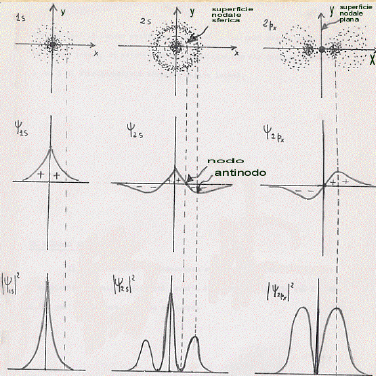 Riferiamoci all’atomo di idrogeno e consideriamo la figura seguente relativa agli orbitali 1s, 2s, 2px (disegnati ora non più con le superfici limite ma con la densità di probabilità elettronica) ed alle rispettive ψ e ψ modulo quadro.