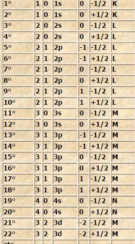 [nella prima colonna è indicato l’elettrone in oggetto; nella seconda è indicato il numero quantico principale n che compete al dato elettrone; nella terza è riportato il numero quantico secondario l del dato elettrone; nella quarta è riportato il livello o orbitale in cui ci troviamo nell’atomo in considerazione; nella quinta vi è il numero quantico magnetico m; nella sesta il numero quantico di spin ms; nell’ultima è riportato lo strato a cui appartiene l’elettrone].