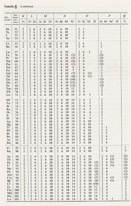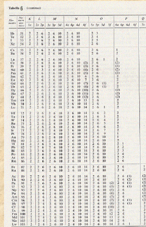 Nella Tavola 5 abbiamo riportato uno schema riassuntivo di tutte le possibili combinazioni dei numeri quantici tra loro, mentre sella Tavola 6 riportiamo la distribuzione degli elettroni per tutti gli atomi degli elementi della tavola periodica.