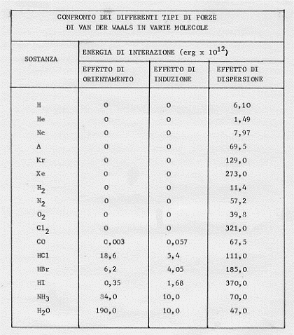 Resta da ultimo da fare il confronto delle forze di orientazione di Keesom, di quelle di induzione di Debye e di quelle di dispersione di London per differenti coppie di atomi e di semplici molecole. Il risultato di questo calcolo fatto da London nel 1937 e da Margenau nel 1939 è riportato nella seguente tavola. Come si può vedere, solo nelle molecole fortemente polari e con piccola polarizzabilità, come H2O, le forze di dispersione sono di secondaria importanza rispetto alle forze di orientamento. Si osservi inoltre che le forze di induzione sono sempre praticamente trascurabili: