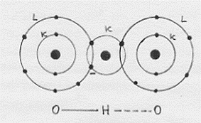 Osservando la figura sembrerebbe esservi un solo legame covalente, quello originato da un elettrone dell’ultima orbita dell’ossigeno di sinistra con l’unico elettrone (segnato in figura come un segno meno a fianco) dell’idrogeno. Ma quella di figura è una situazione statica. In realtà l’elettrone dell’idrogeno (come del resto tutti gli altri) si muove molto rapidamente passando alternativamente a formare il legame covalente con l’ossigeno di sinistra e con quello di destra.
