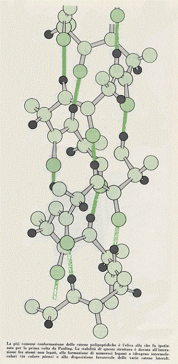 Disegno schematico di una catena peptidica, alla base di proteine ed amminoacidi. Nella prima figura i pallini neri sono legami idrogeno. Nella seconda, vi è la schematizzazione della prima per far notare che il legame idrogeno (linea tratteggiata) attraversa tutto l’asse della macromolecola. Osservo che il simbolo R sta ad indicare l’inizio di una catena laterale di altri componenti (residui amminoacidi)