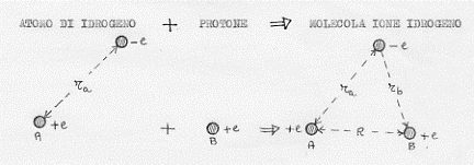 Confrontando le espressioni di V e T ottenute ora con quelle che avevamo trovato per l’atomo di idrogeno (a meno del K che qui abbiamo considerato uguale ad 1) si vede subito che differiscono per il fatto che in questo ultimo caso si hanno tre termini per l’energia potenziale, mentre allora avevamo solo quello relativo all’interazione elettrostatica, tra il nucleo e l’elettrone. Facendo i conti si è trovato che l’energia potenziale prima della reazione (riferendosi alla figura è V’ = – e2/ra) vale V’ = – 2,62.106 joule e che l’energia cinetica (T’ = 1/2 mv2; con m = massa e v = velocità dell’elettrone) vale T’ = 1,31.106 joule, mentre le energie potenziale e cinetica dopo la reazione valgono rispettivamente V = – 3,16.106 joule, T = 1,58.106 joule. Si vede quindi che le energie potenziale e cinetica dopo la reazione valgono rispettivamente: