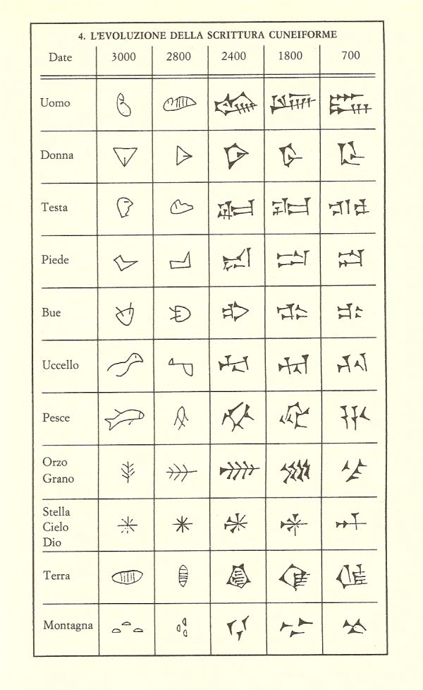 Con il crescere della comunità e delle pratiche via via più specialistiche la memoria si può solo mantenere scrivendo dei documenti che raccolgono le conoscenze. Ebbene, in tutte le cose che sono andato dicendo è mancato un cenno all’importante conquista della scrittura. In Mesopotamia essa sarebbe nata intorno al 3300 a.C. a Sumer ed Elam per esigenze commerciali ed amministrative; mentre in Egitto, i primi documenti scritti, anche qui per esigenze amministrative, sono databili intorno al 3100 a.C.. Il substrato utilizzato è l’argilla per la Mesopotamia ed il papiro per l’Egitto. Parliamo quindi di conquiste recenti che abbisognano di moltissimo tempo per affinarsi. I primi modi di scrittura sono pittografici, gli oggetti vengono cioè rappresentati con elementari disegni stilizzati. E si tratta solo di oggetti perché la primitiva funzione della scrittura non prevede la trascrizione del pensiero, cosa estremamente complessa e molto più tarda. Si può dire che il sostrato influì sui modi di scrittura. In Mesopotamia, poiché l’argilla umida mal si prestava a volute e ghirigori di vario genere, il disegno viene scomposto in trattini che vengono incisi più facilmente con un chiodo (la forma di tali trattini è quella di un cuneo e per questo tale scrittura si chiama cuneiforme). Via via il disegno si semplifica sempre più, con l’eliminazione di ogni accessorio, tanto che, da un certo punto, diventa complesso se non impossibile risalire da alcune linee all’oggetto che esse avrebbero dovuto rappresentare. Alcuni esempi sono mostrati nella tabella seguente: