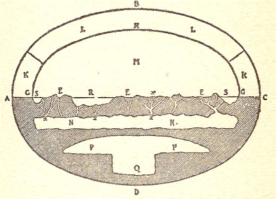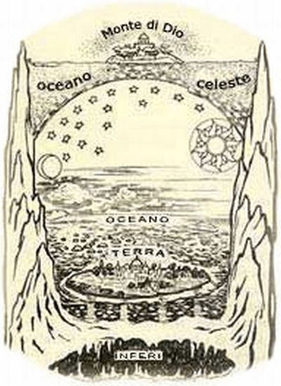 Il disegno seguente è la ricostruzione schematica fatta da G. Schiapparelli, del mondo biblico(9): ABC rappresenta il cielo superiore; ADC il contorno dell’abisso; AEC il piano della terra e dei mari; in GHG vi è il firmamento o cielo inferiore; in KK i depositi dei venti; in LL i depositi delle acque superiori (piogge), della neve e della grandine; M è lo spazio occupato dall’aria dove corrono le nubi; in NN abbiamo le acque del grande abisso che alimentano in xxx le fonti, i fiumi ed i mari (Dio… separò le acque, che sono sotto il firmamento, dalle acque che son sopra il firmamento – Genesi 1, 7); PP è la zona del limbo mentre Q, la sua parte inferiore è l’inferno vero e proprio.