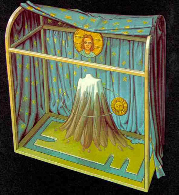 (9) Altre ricostruzioni fatte seguendo la Bibbia (queste tutte interne al cristianesimo), raccontano un universo costruito come una casa, ad imitazione dell’Arca dell’Alleanza di Mosè: due spazi quadrangolari sovrapposti ed una copertura arrotondata.
