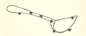 Le 7 stelle che stanno verso la coda dell’orsa (sic!) sono quelle che vediamo facilmente osservando il cielo. Qualcuno, forse in Mesopotamia, aggiungendo altre stelle ha pensato di individuare il disegno di una Orsa. Ma la Bibbia, bucolicamente, ricava da quelle 7 stelle un’altra costellazione, il falcetto, mostrato di seguito: