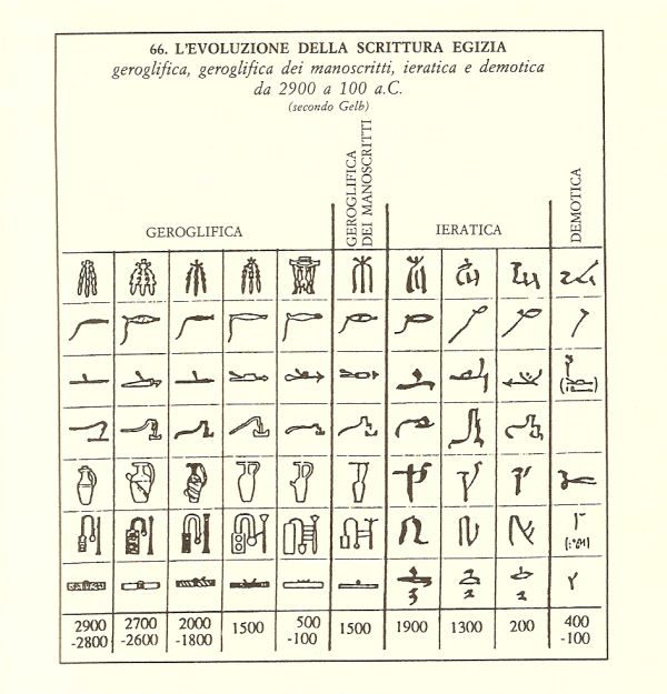 Successivamente i caratteri pittorici subiscono delle semplificazioni ma in ambiti differenti si scrive in modo differente, mantenendo in parallelo diversi modi di scrittura (geroglifico essenzialmente per templi, monumenti e tombe; geroglifico per manoscritti; scrittura ieratica utilizzata dai sacerdoti e scrittura demotica in uso tra gli scribi). La tabella che segue mostra le evoluzioni nei differenti ambiti (si osservi l’irriconoscibilità, negli ultimi simboli, dei geroglifici primitivi):