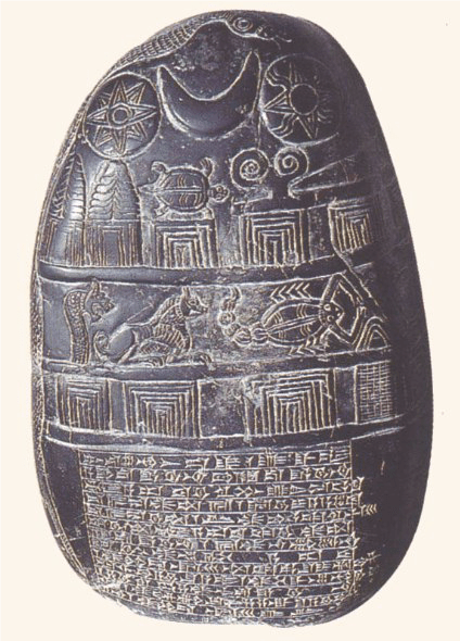 (13) Oltre alle tavolette abbiamo notizie astronomiche anche da alcune pietre (introdotte intorno al 1350 a.C. e chiamate kundurrus) che segnavano i confini di proprietà di terreni su cui erano incise maledizioni che avrebbero colpito chi non rispettava questi confini ma erano decorate con simboli divini che corrispondevano a pianeti (Marduk-Giove, Nabu-Mercurio, Nergal-Marte e Ninurta-Saturno) e costellazioni (Toro, Leone, Scorpione, Sagittario, Capricorno, Acquario, probabilmente Ariete e Vergine e precursori dei Pesci e dei Gemelli). Gli originali di questi kudurrus venivano conservati nei templi come una sorta di ex-voto per avere la benedizione dei vari dei e quindi un buon raccolto [tratto dall’articolo citato in nota 11: http://www.racine.ra.it/planet/testi/costel.htm. Riporto di seguito alcune immagini di kundurrus: