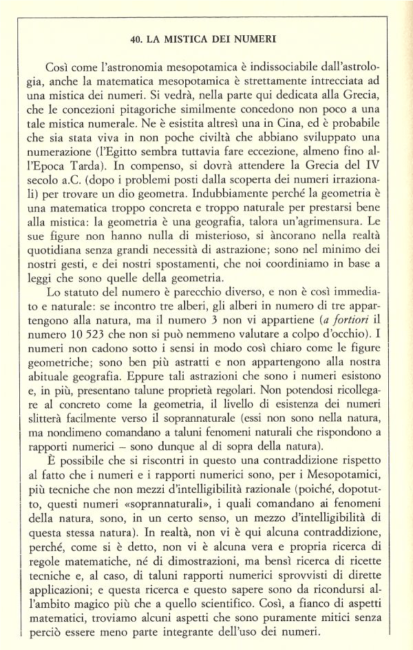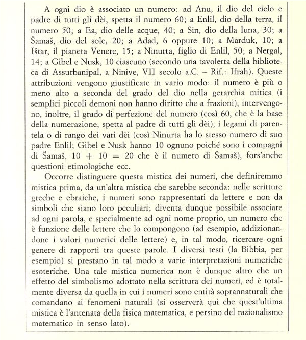 (18) Va osservato che non occorre confondere la mistica dei numeri in Mesopotamia con quella che sarà si Pitagora. La cosa l’avevo già accennata quando avevo discusso della matematica in Mesopotamia ma non è male ribadirla. Riporto anche qui un breve brano di Pichot