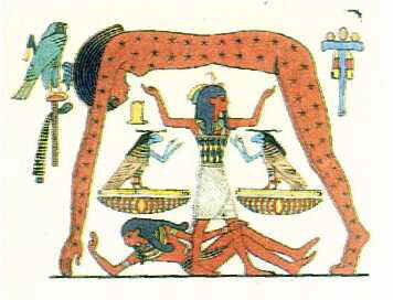 Il disegno che segue, riferito alla cosmologia egizia, sembra del tutto diverso ma rappresenta la stessa cosa. Si tratta di un dipinto che, in differenti varianti, troviamo in molti templi e tombe egiziane (la variante successiva è più chiara nel descrivere alcuni dettagli). La donna arcuata, la dea del Cielo Nut, rappresenta il cielo (nella figura immediatamente seguente vi sono anche disegnate le stelle). Nut, il cielo, è sostenuta dal dio dell’Aria, Shu. Sdraiato in basso vi è il dio della Terra, Geb. Il dio sulla destra è Thot che, tra l’altro, rappresenta la Luna (in talune rappresentazioni si vede una feroce scrofa che ad intervalli regolari di un mese divora il dio Luna che regolarmente risorge e torna a crescere). Sopra al cielo vi è il battello del Sole che, idealmente, viaggia nell’acqua del Nilo superiore. Il Nilo superiore, come sembra dirci il disegno, scorrerebbe lungo lo Zodiaco (via lattea ?)dove fluttuano gli astri mobili (Sole, Luna, pianeti).