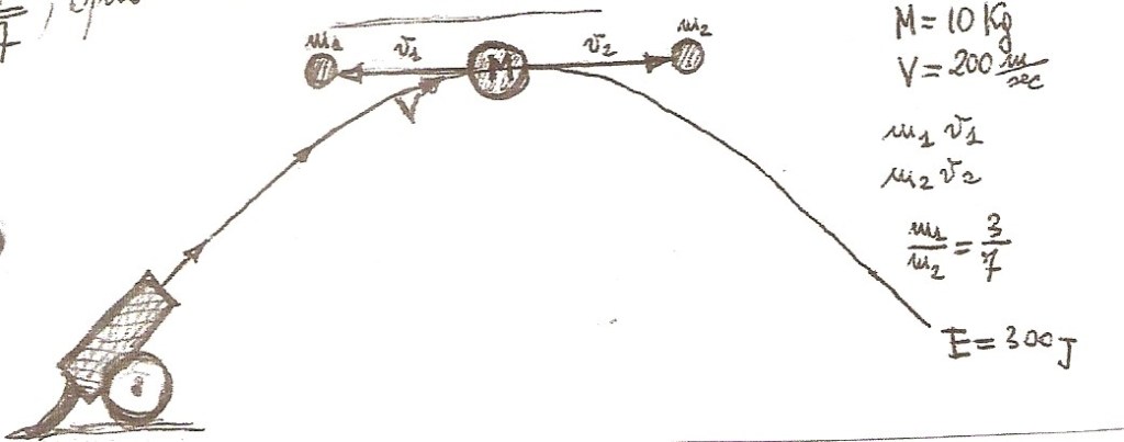 Problema 18 – Un proiettile di massa M = 10 Kg nel vertice della sua traiettoria parabolica esplode in due frammenti che vengono proiettati nella direzione tangente alla traiettoria (vedi figura). Se nell’esplosione viene liberata un’energia E = 300 J, la velocità del proiettile nell’istante in cui si produce l’energia è V = 200 m/s e le masse m1 ed m2 dei due frammenti stanno nel rapporto 3/7, quali sono le velocità v1 e v2 dei due frammenti ?