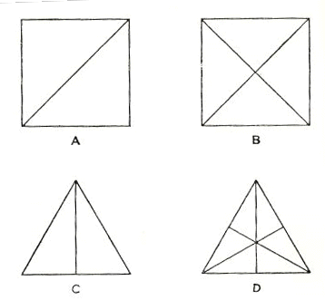 Serve una qualche spiegazione. Platone inizia con l’affermare una cosa per molti versi cara ai pitagorici: ogni superficie piana è composta da triangoli. Tutti i triangoli sono fondamentalmente di due tipi: il triangolo rettangolo isoscele (angoli di 90°, 45°, 45°) e il triangolo rettangolo scaleno (angoli di 90°, 60°, 30°). Ora, mentre per il triangolo rettangolo isoscele non vi sono problemi, per quello scaleno ve ne sono; essi possono infatti essere, al contrario degli altri, della più incredibile varietà. Com’è possibile allora decidere per quello con angoli di 90°, 60°, 30°? Semplicemente perché è (letteralmente) il più bello. E la bellezza di questo triangolo discende soprattutto dal fatto che, se ripetuto sei volte, realizza un triangolo equilatero (figura D seguente). Occorre osservare che Platone non realizza il triangolo equilatero nel modo più semplice mediante due soli dei triangoli suddetti (figura C seguente). Da questi due triangoli si generano le quattro entità che sono alla base della costituzione del mondo: terra, acqua, aria, fuoco. Per vedere come, occorre intanto osservare che quattro triangoli rettangoli isosceli, uniti tra loro attraverso l’angolo retto, formano un quadrato (figura B seguente). E’ anche qui da notare che il quadrato non è costruito nel modo più semplice, mediante due triangoli rettangoli isosceli (figura A seguente).