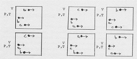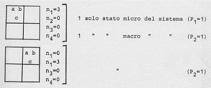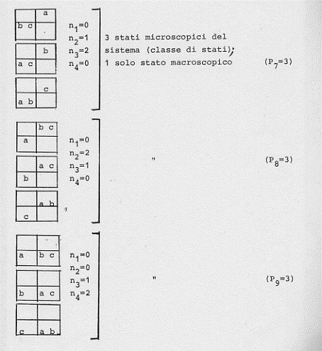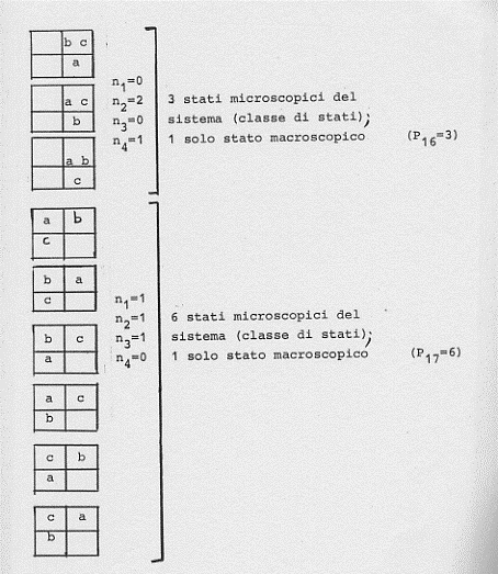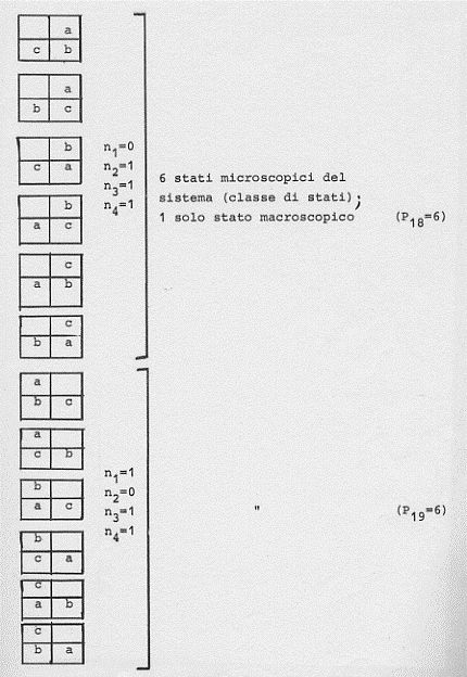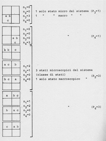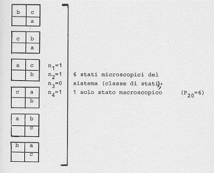 Si può infatti vedere ciò con un esempio molto semplice. Supponiamo un gas di tre molecole (a, b, c) in un volume V. Supponiamo poi che le tre molecole abbiano la stessa velocità nella stessa direzione (verso la parete destra del contenitore di volume V). Si vede subito che una fissata configurazione P, V, T per l’intero sistema si può ottenere in sei diversi modi (scambiando in tutti i modi possibili le posizioni delle tre molecole tra di loro):