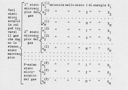 Come abbiamo detto un certo stato macroscopico della materia (gassosa, liquida o solida che sia) è caratterizzato da una terna P, V, T che noi misuriamo. Questo stato può essere realizzato microscopicamente in un grande numero di modi diversi a seconda delle posizioni e delle velocità e quindi delle energie che possiedono le singole molecole. Si può cioè misurare, in uno stesso volume occupato da un gas, una determinata pressione ed una determinata temperatura e queste grandezze, pressione e temperatura, si possono ottenere con le molecole del gas distribuite in modi diversi con energie diverse.