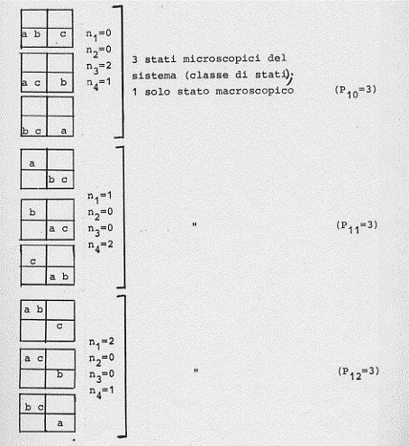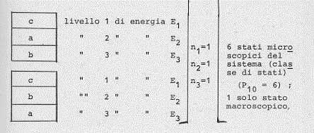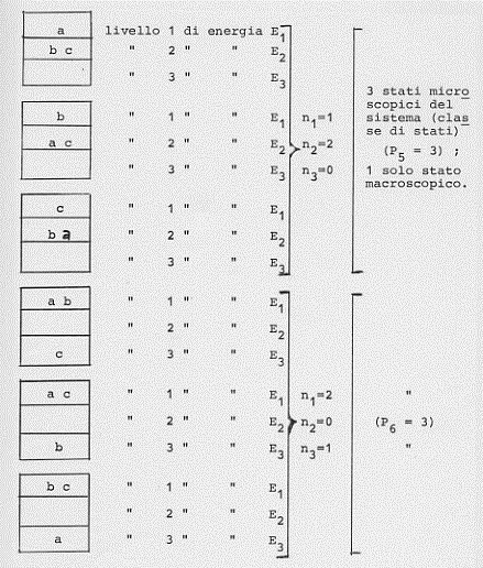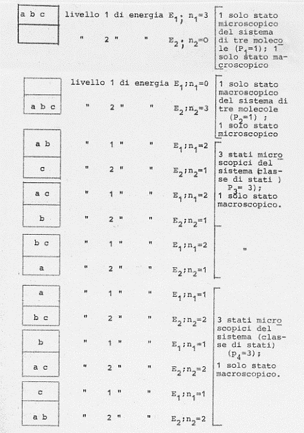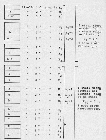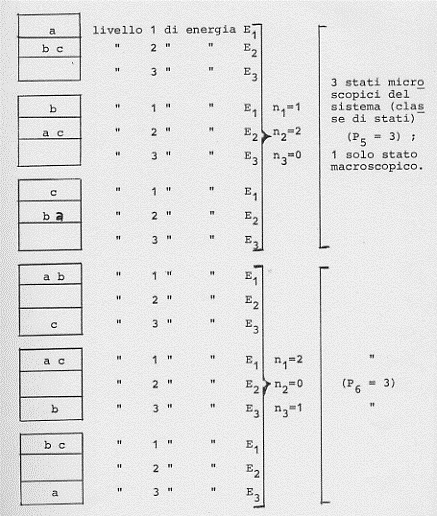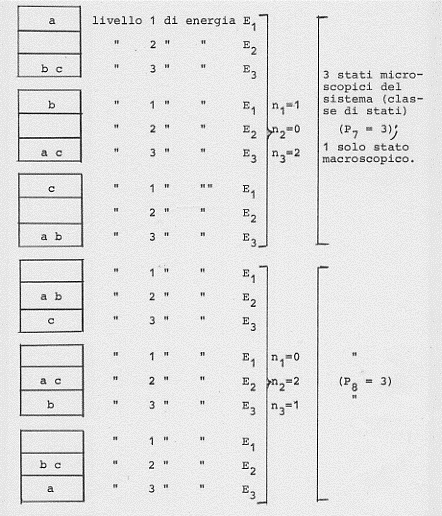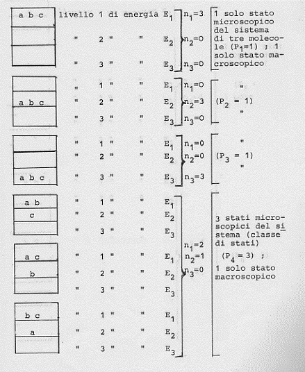 Facciamo un altro esempio. Siano date sempre tre molecole (a, b, c) da distribuire in tre diversi stati possibili in cui il sistema delle tre molecole può trovarsi (essendo sempre l’energia totale una costante).