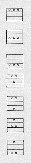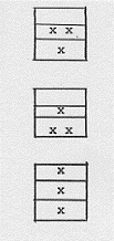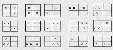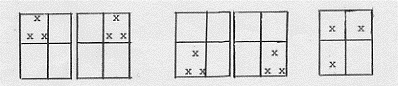Avevamo tre particelle da distribuire in due celle, la distinguibilità delle particelle ci aveva fatto trovare otto distribuzioni differenti. Vediamo ora, attesa 1’indistinguibilità delle nuove particelle, quante distribuzioni otteniamo (ogni particella sarà ora indicata con una x).