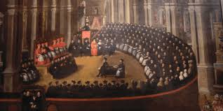 Nel primo periodo di Concilio, quello che si svolse sotto Papa Paolo III, si stabilirono alcune cose: le Scritture dovevano essere interpretate dalla Chiesa e non erano ammesse loro libere letture come teorizzavano i luterani; si definirono i concetti di grazia divina e libertà umana; si fissarono i sacramenti proclamando quelli del battesimo e della cresima; si regolò l’accesso all’episcopato e quello ai benefici. Sembrava si procedesse sulla buona strada quando Carlo V, convintosi del fatto che mai i protestanti avrebbero accettato le conclusioni del Concilio, decise di risolvere il problema dello scisma con la guerra. L’Imperatore dichiarò che la Lega di Smalcalda che, come accennato, era stata organizzata con fini difensivi dai principi protestanti, era ribelle e mobilitò l’esercito. I partecipanti al Concilio ebbero paura vedendo movimenti di truppe. Il Papa pensò di spostare l’assemblea in una città dello Stato Pontificio come Bologna, abbandonando la città imperiale di Trento. Contrari a questa soluzione erano i filoimperiali, i vescovi e cardinali di Napoli e spagnoli. Vinsero coloro che auspicavano lo spostamento a Bologna anche per lo scoppio di un’epidemia di tifo che uccise uno di loro. Dopo varie tergiversazioni nel marzo del 1547 fu deciso lo spostamento del Concilio. La prima sessione a Bologna iniziò ad aprile del 1547 e durò poco più di un anno. Si discusse di: eucarestia, contrizione, confessione, estrema unzione e consacrazione sacerdotale. Tra i teologi si aprirono ampie discussioni sulle indulgenze e sul Purgatorio. In tema di riforma della Chiesa furono affrontati i problemi derivanti dal cumulo di benefici, della poca preparazione dei confessori e dei dilaganti abusi del clero. La successiva sessione, su forte spinta di Carlo V, riprese di nuovo a Trento nel 1551. Come osserva Rendina, lo spostamento del Concilio a Bologna “fu un grave errore che compromise in maniera determinante una riforma generale a cui aderissero anche i luterani aumentando al contrario i termini già netti dello scisma”. Vi fu contrarietà da parte di Carlo V che credeva di risolvere tutto con le armi ma, di fatto, i luterani non sarebbero mai intervenuti in un’assemblea convocata nello Stato Pontificio. Paolo III aveva il problema della morte del figlio Pier Luigi e la cosa lo interessava poco. Sospese il Concilio nel 1548 e lo sciolse definitivamente l’anno seguente. Finiva la possibilità di una Riforma cattolica e, alla ripresa dei lavori, il Concilio divenne un’assemblea che avviò la Controriforma. Questa scelta non era comunque improvvisa perché maturava già in chi aveva istituito la Santa Romana e Universale Inquisizione. L’Inquisizione Romana era stata pensata prima che il Concilio si aprisse, tanto per mostrare l’apertura con cui la Chiesa si apprestava a riconciliarsi. Il 21 luglio 1542, Papa Paolo III emanò la bolla Licet ab initio con la quale creava l’ Inquisizione Romana o Sant’Uffizio(2) sotto la guida di Giovanni Pietro Carafa che (dal 1555) sarà il futuro Papa Paolo IV. Si trattava della riorganizzazione della vecchia Inquisizione Medioevale che, pur non avendo mai smesso di funzionare, non aveva ora strumenti culturali e materiali per intervenire contro le nuove eresie e contro quel grave male che era la cultura in espansione. Era un problema di efficienza della struttura repressiva che aveva fatto pensare ad una commissione permanente di cardinali e alti prelati diretta dal medesimo Papa che doveva mantenere e difendere l’integrità della fede, esaminare e proscrivere gli errori e le false dottrine. Il Carafa, lasciata al Papa la sola possibilità di concedere la grazia, dette tutto se stesso per rendere la nuova Inquisizione uno strumento repressivo di somma efficacia. Prima requisì un edificio romano e lo dotò di una prigione, quindi emanò 4 norme di procedura per gli inquisitori: punire anche solo per sospetto; non avere alcun riguardo per i potenti; essere intransigente con chiunque avesse trovato rifugio da un potente; nessuna accondiscendenza con i calvinisti. Il futuro Paolo IV era convinto che l’azione sarebbe stata più efficace quanti più potenti si colpivano perché la salvezza delle classi inferiori dipende dalla punizione dei grandi. Inoltre, ma non lo disse, quanti più potenti si colpivano, meno avversari avrebbe avuto. In ogni caso si dette il via ad un’epurazione massiccia in ogni istituzione, ecclesiastica o laica. Ma il crudele maniaco Carafa vedeva con rabbia quella possibilità di grazia che aveva il Papa e riuscì ad arrivare al pieno della sua crudeltà, inaugurando roghi di ebrei convertiti ad Ancona e di eretici a Roma, solo quando divenne egli stesso Papa imponendo come Grande Inquisitore Michele Ghislieri che alla sua morte, come no!, divenne a sua volta Papa, l’altro criminale chiamato Pio V (e per questo santificato). Una festa di inquisitori che diventano Papi.