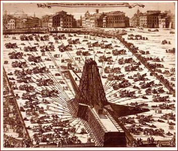 Ricostruzione dell’operazione con il migliaio di operai addetti all’opera di innalzamento.