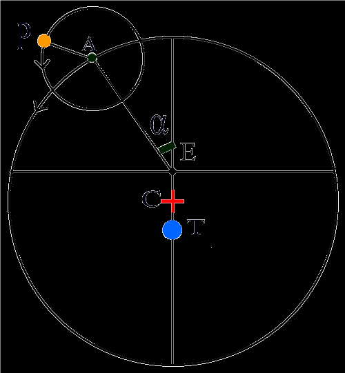 Combinazione di eccentrico, epiciclo ed equante. Il pianeta P ruota a velocità lineare costante nel suo epiciclo mentre il centro dell’epiciclo A ruota a velocità angolare costante intorno al punto E (punto equante), velocità che può essere variabile rispetto al centro della circonferenza C. La Terra T risulta in posizione eccentrica. La posizione che Tolomeo ritenne più favorevole per E è sulla linea che unisce la Terra con il centro della circonferenza e tale che TC = CE. In definitiva E era il centro del moto angolare uniforme, C era il centro delle distanze uguali mentre T era il centro delle osservazioni.