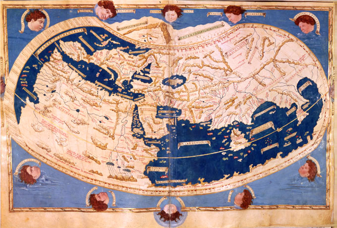 Fornisco ora un cenno ad altri argomenti studiati e sviluppati da Tolomeo, ad iniziare dalla sua Geografia (o Cosmographia). Fu Tolomeo, come accennato, ad introdurre il reticolato sovrapposto alle mappe e quindi al metodo delle latitudini e longitudini (con la grave complicazione che all’epoca non si avevano metodi affidabili per determinare quest’ultima) per individuare un punto sulla carta geografica. Egli catalogò fiumi, monti, città, … con molti errori dovuti proprio alla determinazione della longitudine. Egli fornì 26 mappe particolari(5) da affiancare a quella complessiva del mondo, mostrata nella figura seguente. Ed a proposito di tale carta del mondo allora conosciuto vi è un’osservazione da fare. Come dimensione della Terra, Tolomeo prese i 180 mila stadi ricavati del geografo Posidonio di Rodi (uno stoico che visse all’incirca tra il 130 ed il 50, anche a Roma dove fu maestro di Cicerone) e non i 252 mila stadi di Eratostene. Questa valutazione comportò che all’Eurasia veniva assegnata una longitudine di 180° invece dei circa 130° che occupa. Osserva Boyer che questo grande errore indusse i navigatori come Colombo ad affrontare il viaggio verso le Indie dalla parte dell’Atlantico, viaggio che non avrebbero intrapreso con i dati di Eratostene.