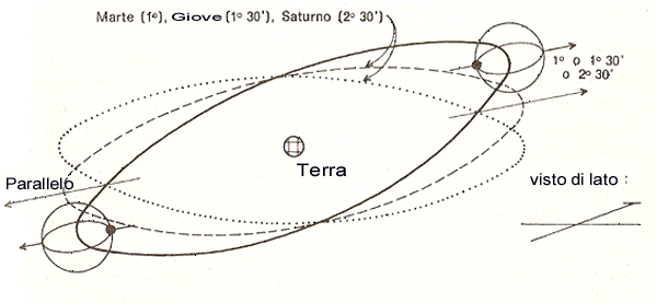 Figura a. La figura è relativa ai pianeti esterni. Il piano dell’equatore dell’epiciclo è parallelo a quello dell’eclittica, benché non lo sia il piano dell’orbita.