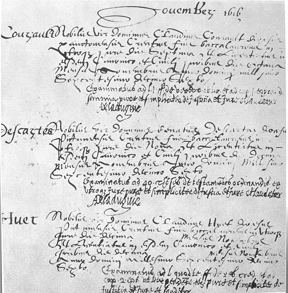 Nel 1667 le spoglie di Descartes(8) furono restituite alla Francia per essere sepolte, dopo aver vagato per vari siti, a Saint Germain des Prés. Qualcuno ha osservato che i grandi sono ben accetti in patria solo quando sono morti.