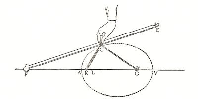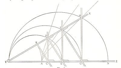 Costruzione con riga e compasso (l’insieme dei due strumenti costituisce il compasso di Descartes) del luogo che discende dal Problema di Pappo nel caso di 4 rette. Inizio del Libro Secondo [Géométrie; 44; 305].