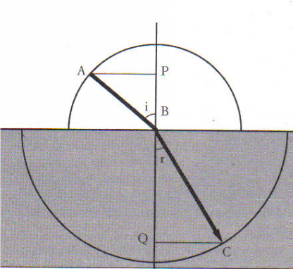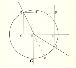 (17) Descartes non scoprì la rifrazione ma fece conoscere, per primo, la legge che aveva ricavato il matematico ed astronomo olandeseWillebrord van Royen Snell (1580-1626), pubblicandola nella Dioptrique e senza entrare in dettagli matematici. Egli la scrisse come oggi la conosciamo, introducendo il rapporto tra i seni degli angoli di incidenza e rifrazione. Riferendoci alla figura, si ha: