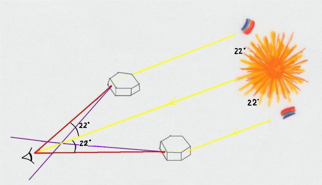 Questi cristallini non sono in posizioni stabili ma continuamente mossi dalle correnti d’aria. Quando una maggioranza di essi è disposta rispetto ai raggi solari come nelle figure precedenti, allora si ha il fenomeno che è comunque raro e difficilmente persistente nel tempo. Tutti quei raggi che all’incidere in un cristallo piatto, lo fanno attraverso una delle sue facce laterali ed escano rifratti per la faccia laterale seguente a quella contigua, arriveranno all’occhio dell’osservatore in forma di macchia luminosa colorata o paraelio. In queste condizioni si ha luogo alla circostanza che il tragitto del raggio luminoso continua all’interno del cristallo parallelamente alla faccia intermedia. La deviazione che il raggio rifratto subisce rispetto alla sua traiettoria d’incidenza è di 21°7′. In definitiva, in ogni cristallino, ha luogo una rifrazione come se si avesse a che fare con un prisma di 60° con conseguente separazione dei colori dello spettro solare (si hanno immagini alla stessa altezza angolare del Sole, rossicce al loro interno). La somma degli effetti su tutti i cristallini origina un cerchio che contorna il Sole (nell’osservazione di Scheiner erano tre) accompagnato da quattro macchie nelle vicinanze del Sole di luce tremolante, i paraeli, che sono immagini rifratte dello stesso Sole.