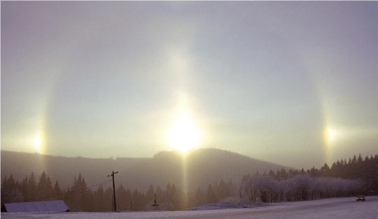 Sommando l’effetto di più cristallini di ghiaccio si formano le immagini del Sole alle sue destra e sinistra