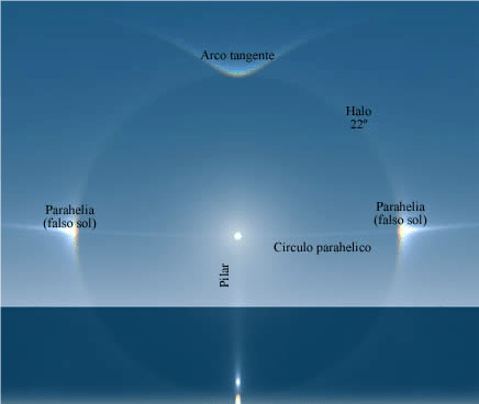 Parahelia = Paraelio; Circulo parahelico = Circolo paraelico; Halo = Alone; Pilar = Pilastro