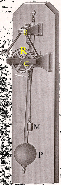 La massa M, cadendo, muove la ruota dentata R tramite una corda che tende a svolgersi da un rullo. Su tale ruota agisce un sistema di distribuzione (scappamento) imperniato in D e mosso dal pendolo P. Lo scappamento ABD, che serve a trasformare il moto alternato del pendolo in moto circolare e a fornire energia, fa si che quando il pendolo si trovi ad una estremità del suo percorso venga spinto nella direzione opposta, e contemporaneamente la ruota dentata avanzi di uno scatto. Una volta che il pendolo è giunto all’estremo opposto della traiettoria il processo si inverte e la ruota avanza di un altro scatto.