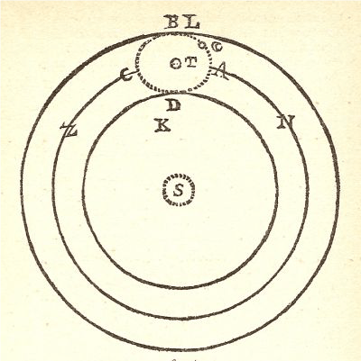 Dico verso B piuttosto che verso D, perché, avendo inclinazione a continuare il loro movimento in linea retta, devono andare verso l’esterno del cerchio ACZN che descrivono piuttosto che verso il centro S. Ora, passando così da A verso B, obbligano il pianeta T a girare con esse intorno al proprio centro; e, reciprocamente, il pianeta, girando così, dà loro occasione di avviare il loro corso da B verso C, poi verso D e verso A, formandogli intorno un cielo particolare, con cui esso deve in seguito continuare a girare, dalla parte chiamata Occidente a quella chiamata Oriente, non solo intorno al Sole, ma anche intorno al proprio centro [Monde; 14; 88-89]
