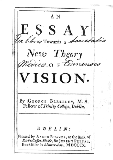 ed è già un manifesto del suo credo filosofico, l’immaterialismo (non esiste il mondo percepito in sé ma solo la sua percezione, esse est percipi). E’ una sorta di trattato di psicologia sperimentale e filosofia in cui si discute di come percepiamo, con la vista, la distanza, le dimensioni e la posizione degli oggetti. Altre sue opere che svilupparono la sua filosofia sono: A Treatise Concerning the Principles of Human Knowledge (1710), opera principale di Berkeley che contiene l’esposizione