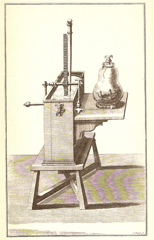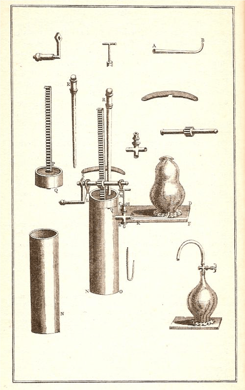 Al centro una delle pompe da vuoto di Boyle-Hooke, con alcuni dettagli e accessori intorno. Il grande globo dentro cui si doveva fare il vuoto risultò una grave complicazione per la tenuta e perché occorreva pompare per molto tempo con molta fatica. Si servì di uno o più uomini molto robusti.