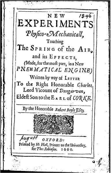 Nel 1657 iniziò la parte rilevante della sua carriera scientifica quando Boyle lesse i lavori che realizzava Otto von Guericke con la macchina da vuoto(7). Volle costruire una macchina simile ed allo scopo si servì di un assistente ed abilissimo sperimentatore che sarà poi un fisico di primo piano, Robert Hooke. In breve tempo realizzarono una pompa da vuoto ad aria che aveva delle ottime prestazioni e con essa realizzarono esperimenti che Boyle raccontò nel suo New Experiments physico-mechanicall, Touching the Spring of the Air and its Effects del 1660.