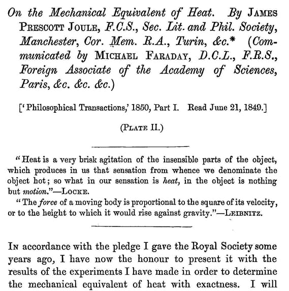 La quantità di calore capace di aumentare la temperatura di un pound [o libbra o 453,59237 grammi, ndr] di acqua di un grado della scala Fahrenheit è uguale a, e può essere convertito in, una forza meccanica capace di sollevare 838 libbre [circa 380 Kg, ndr] ad una altezza perpendicolare di un piede [30, 48 cm, ndr].