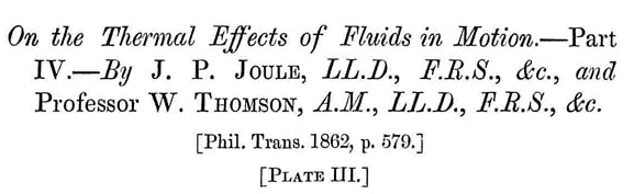 Il lavoro sull’effetto Joule-Thomson produsse varie ed articolate memorie piene di misure e di elaborazioni teoriche sviluppate con la grande abilità matematica di Thomson. La prima di queste memorie, On the Thermal Effects of Fluids in Motion, fu pubblicata nel 1853 sulle Philosophical Transactions of Royal Society (riporto di seguito tutta la prima pagina di tale lavoro perché in essa vi è un sunto di come si è arrivati a scrivere la memoria e cosa essa si propone).