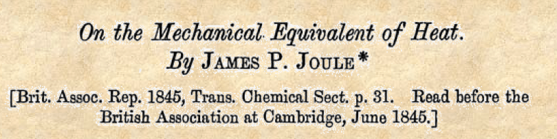Nel giugno 1845 Joule presentò una comunicazione alla riunione della British Association a Cambridge. Un breve resoconto della comunicazione, On the Mechanical Equivalent of Heat, fu pubblicato nei Brit. Assoc. Rep., trans.