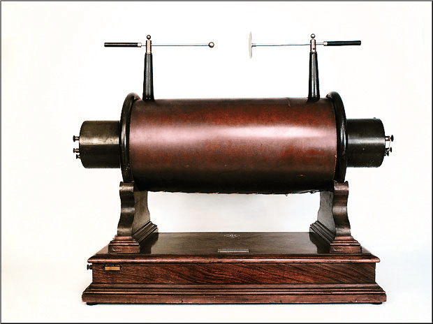 (3) Un rocchetto di Ruhmkorf serve per la produzione di scariche elettriche ad alta tensione ed era un apparato di enorme interesse all’epoca perché non vi era altro in circolazione per produrre tali scariche. Ebbe per circa 50 anni un ruolo fondamentale per lo sviluppo di almeno due campi della fisica, le onde elettromagnetiche e, appunto, la scarica nei gas. Lo strumento, riportato in figura I (nella figura II vi è una sua sezione; nella figura III vi è un particolare della figura precedente), funziona nel modo seguente.