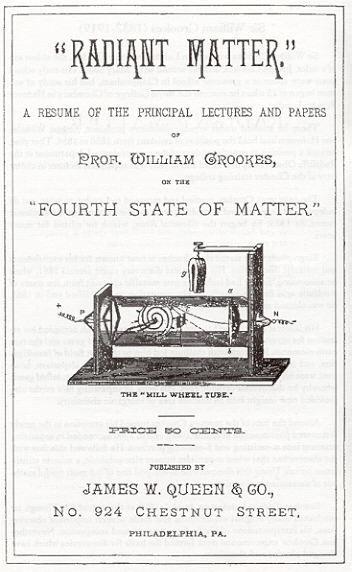 (10) W. Crookes, (Phil. Mag. 7, 57, 1879). Ancora nel 1879 in On radiant matter, una conferenza tenuta alla British Association for the Advancement of Science a Sheffield, Crookes presentò molte delle proprietà dei suoi tubi e discusse della radiant matter o plasma, il quarto stato della materia.