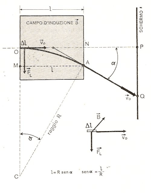 In questo disegno i raggi catodici viaggiano lungo la linea OP. Il quadrato colorato rappresenta la zona in cui agisce il campo magnetico B (per una lunghezza l) perpendicolarmente alla traiettoria dei raggi. Dl è un elemento di corrente costituito dai raggi nella zona del campo magnetico. Il tratto OA dei raggi deviati è l’arco di cerchio del quale occorre considerare il raggio R. Nel piccolo disegno a destra è rappresentata la regola della mano sinistra per stabilire i versi di: campo magnetico (B), forza di Lorentz (FL) e corrente (l’elemento Dl e la sua velocità di spostamento v0).